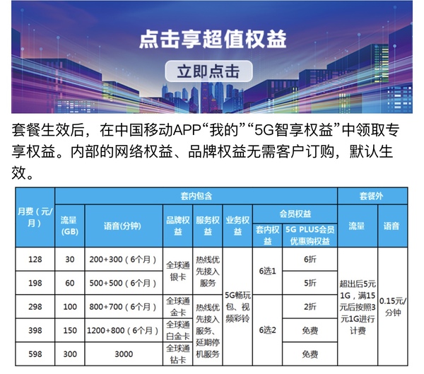 中国移动的5G智享套餐分为个人版和家庭版。个人版按月费共分为128元、198元、298元、398元和598元共五档。其中128元档包含30G流量,每月200分钟外加半年300分钟语音通话;598元档包含300G流量,3000分钟语音通话。以上各档位超出套餐部分,流量按5元1G收费,满15元后按照3元1G进行计费,语音按0.15元每分收费。