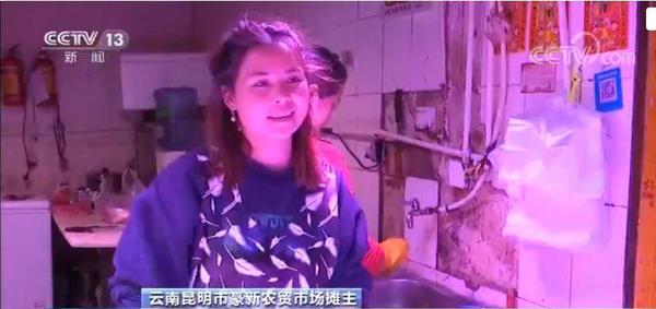 云南昆明市篆新农贸市场摊主:这两天猪肉价是降了一点了,前腿现在65元(一公斤)。