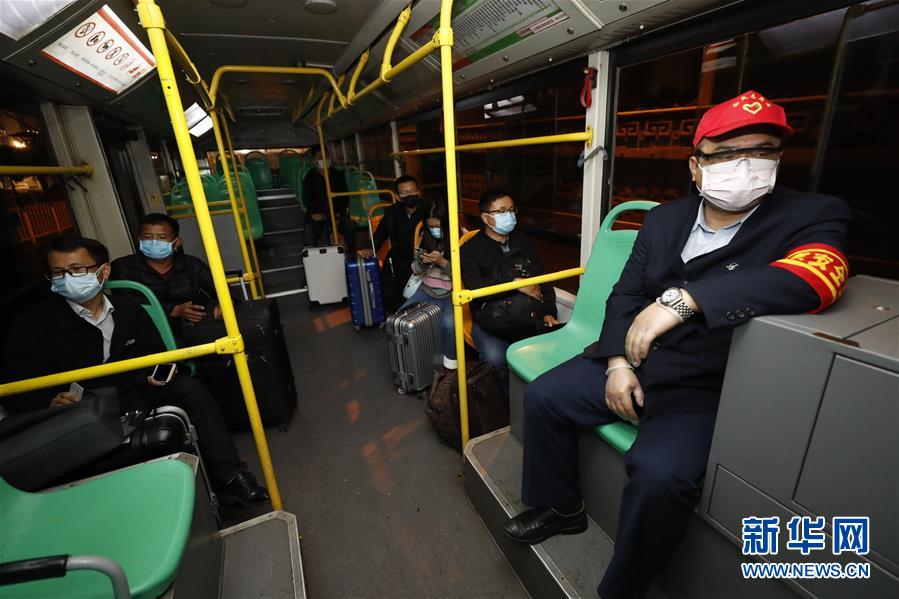 3月25日,乘客乘坐在武昌火车站综合体站始发的首趟518路公交车。 当日起,武汉市部分公交车恢复开行。 新华社记者 沈伯韩 摄
