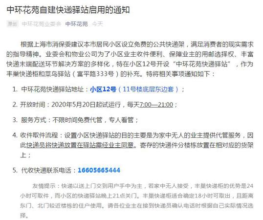 上海中环花苑小区表示,根据上海消保委建议上海市居民小区设立免费的公共快递架,满足消费者的现实需求的指导精神。小区业委会和物业公司为了小区业主收件便利、保障业主的用邮选择权、丰富快递末端配送环节解决方案的多样化,特在小区12号开设“中环花苑快递驿站”,作为丰巢快递柜和菜鸟驿站(富平路333号)的补充。