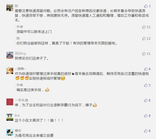 同时,也有不少网友表示支持。有网友称,业主自主选择,业委会提供必要的便利,合理、合情、合法、合规、合民心、合趋势、合利益。既保证使用快递柜的权利,也让市场充分竞争。也有网友表示:“作为快递组织管理过渡手段真的很好,等丰巢合同期满后、期待花苑自己添置的快递柜实现快递柜组织管理。”