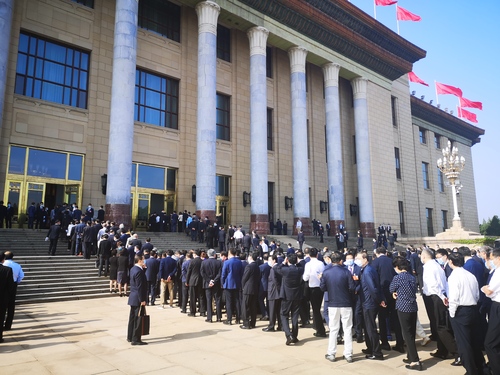 5月22日9时,十三届全国人大三次会议在北京人民大会堂开幕。全国政协委员在大会堂北门有序排队入场,列席会议。