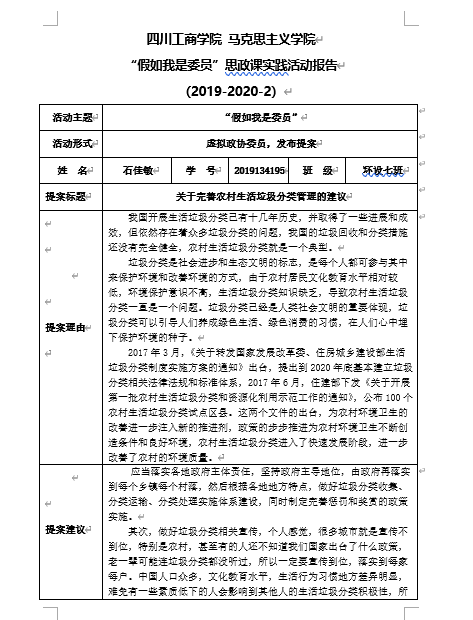 据了解,为深入贯彻2020年4月教育部等八部门发布的《关于加快构建高校思想政治工作体系的意见》(教思政〔2020〕1号)和《关于深化新时代学校思想政治理论课改革创新的若干意见》的文件精神,深化思政课实践教育,四川工商学院马克思主义学院创办了形式多样的“行走课堂”,将思想政治教育融入学生的社会实践、志愿服务、实习实训等活动中。在全国两会召开之际,“行走课堂”依托人民政协报▪人民政协网“假如我是委员”微信小程序,策划了一场思想政治理论课实践教学活动,在学生中掀起了一阵发现问题、建言解决的“模拟提案”热。