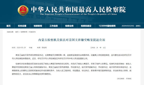 人民网北京5月29日电 (孟植良)据最高人民检察院消息,黑龙江省哈尔滨市政协原党组书记、主席姜国文涉嫌受贿一案,由国家监察委员会调查终结,经最高人民检察院指定,由内蒙古自治区呼伦贝尔市人民检察院审查起诉。近日,呼伦贝尔市人民检察院已向呼伦贝尔市中级人民法院提起公诉。