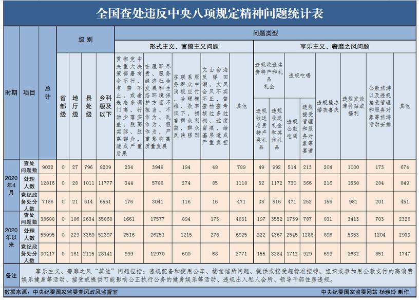 据介绍,为掌握全国贯彻落实中央八项规定精神情况,中央纪委国家监委在各省区市和新疆生产建设兵团、各中央和国家机关、各中央企业和中央金融企业等建立了落实中央八项规定精神情况月报制度。2020年以来,截至4月30日,全国查处违反中央八项规定精神问题情况如下: