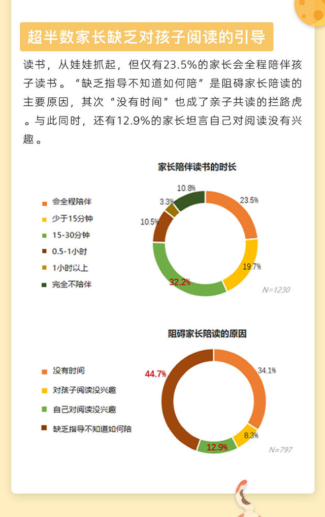 调研中,辅导孩子写作业、陪孩子阅读等,是多数家长最重视的陪伴,但仅有23.5%的家长会全程陪伴孩子读书。“缺乏指导不知道如何陪”是阻碍家长陪读的主要原因,其次,“没有时间”也成了亲子共读的拦路虎,12.7%的家长则坦言自己对阅读没有兴趣。