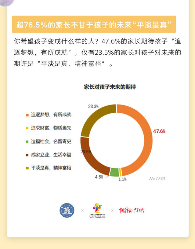 调研中,望子成龙还是大多数家长的期待。47.6%的家长希望孩子“追逐梦想,有所成就”,仅有23.5%的家长对孩子对未来的期许是“平淡是真,精神富裕。”