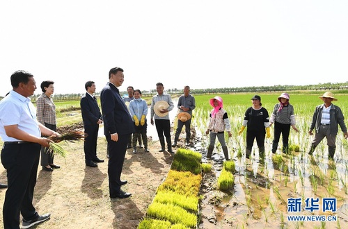 6月8日至10日,中共中央总书记、国家主席、中央军委主席习近平在宁夏考察。这是6月9日下午,习近平在银川市贺兰县稻渔空间乡村生态观光园,同正在劳作的村民亲切交谈。 新华社记者 谢环驰 摄