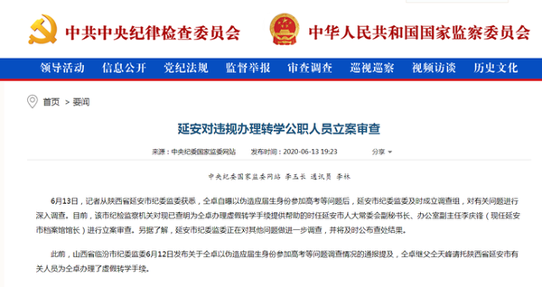 延安通报仝卓事件:对违规办理转学公职人员立案审查