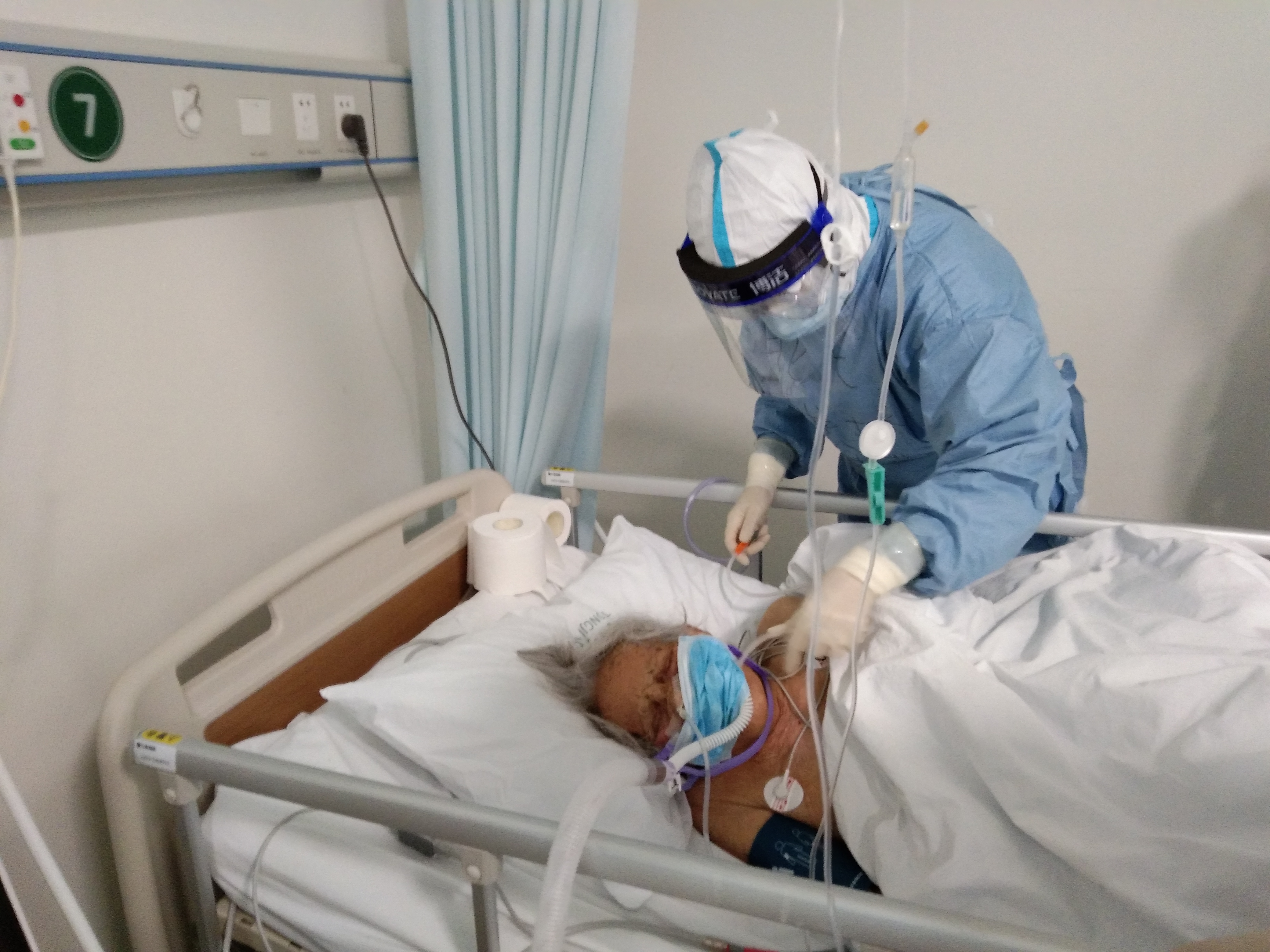 病房里有一位95岁高龄的老人出现痰多症状,需要及时吸痰。在使用开放性吸痰管操作的过程中,接触气溶胶暴露的风险较高,王玉英主动亲自上阵为老人做了两次吸痰。她总像个战士,每次都主动冲向最危险最艰苦的地方。