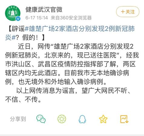 人民网北京6月17日电 (记者温璐)据武汉市卫健委官方微博消息,近日,网传“雄楚广场2家酒店分别发现2例新冠肺炎,北京来的,现已送往医院”,经武汉市洪山区、武昌区疫情防控指挥部了解,两区辖区内均无此酒店。目前武汉市无本地确诊病例,也无境外和外地输入确诊病例。
