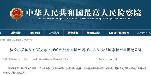 人民网北京6月19日电 据最高检网站消息,经依法审查,2020年6月19日,辽宁省丹东市人民检察院以涉嫌为境外刺探、非法提供国家秘密罪,对加拿大籍被告人迈克尔·斯帕弗向丹东市中级人民法院提起公诉。