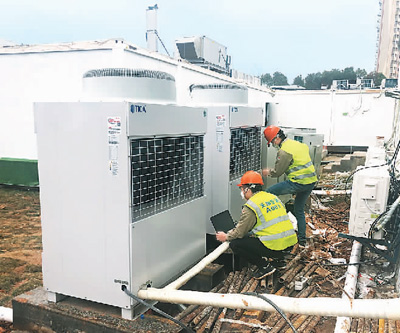 武汉火神山医院施工现场,天加环境科技有限公司工作人员正在调试医用净化空调室外机。