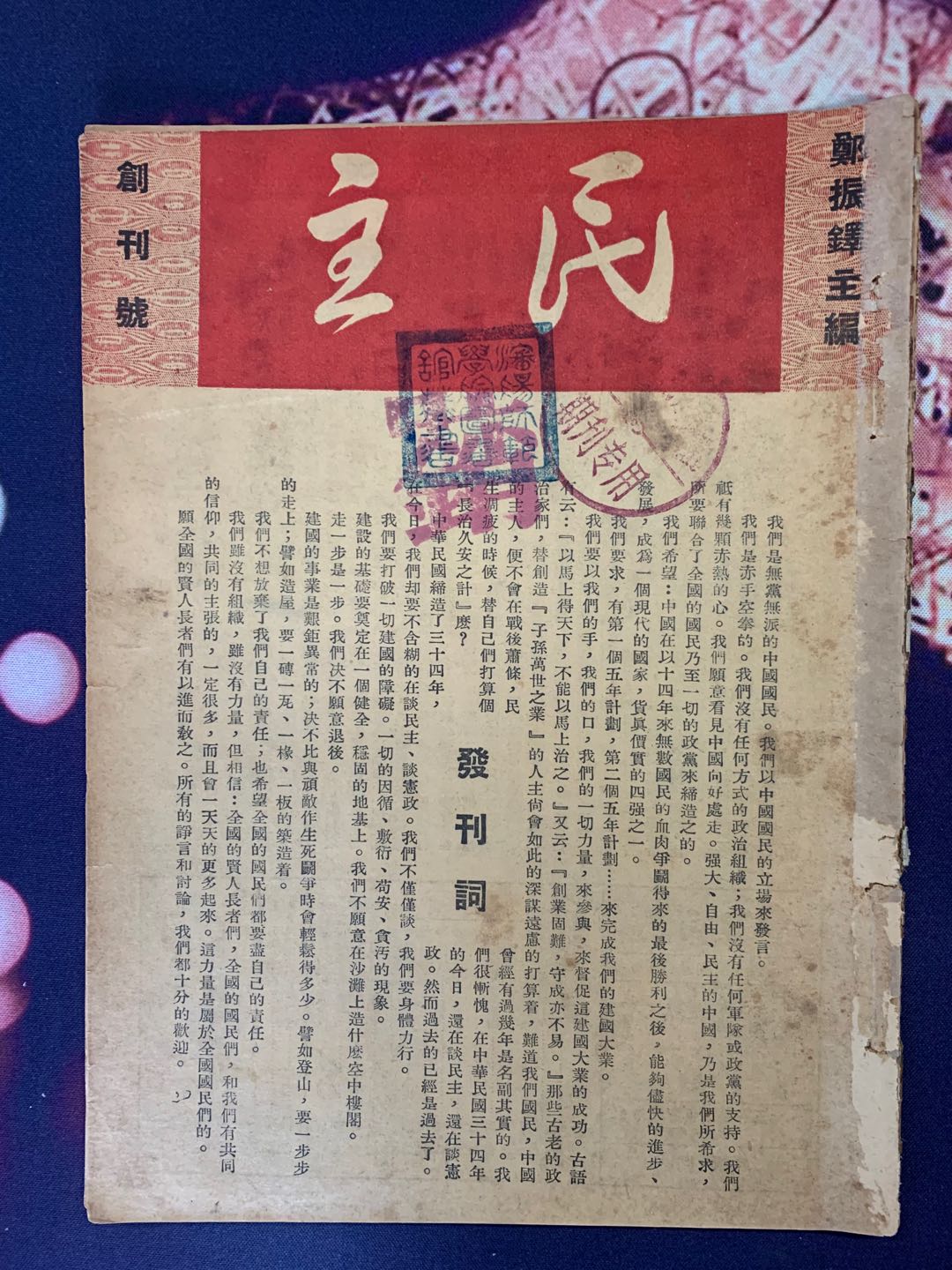 1945年10月13日,《民主》周刊在上海正式创刊。当时大街小巷的书报摊上都摆上了这份十分惹人注目的新杂志。这是抗战胜利后上海第一个以《民主》命名的综合性刊物,也是抗战胜利后全国的主要进步刊物之一。郑振铎写了发刊词和《走上民主政治的第一步》一文,指出在国民党军队接收了敌占区后,第一步就应该恢复人民的自由权,而不是现在的戒严、搜查和压迫。创刊号上还刊登了马叙伦的《思想解放》,周建人《略论这回大战的性质与法西斯的歪曲事实》和许广平等人的20篇文章。《民主》周刊就这样以斗争的姿态出现了。