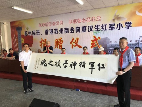 活动中,徐圭逊先生代表香港苏州商会捐资20万元,民进苏州市委专职副主委陆丽瑾代表民进市委捐赠一批体育用品。徐圭逊、杨辉两位书法家还分别捐赠书法作品《红军精神学校之魂》和国画作品《红军精神传万代》,为助力革命老区脱贫攻坚献上一份绵薄之力。