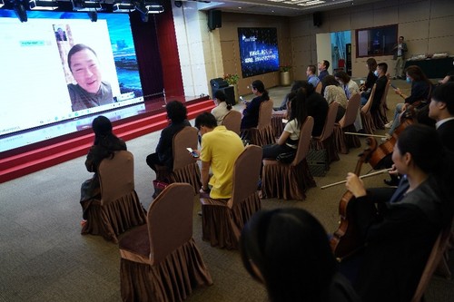 人民政协网北京9月27日电(记者 李寅峰)9月27日,本是在国家大剧院上演一年一度“全球华人乐团音乐会”的日子,但由于受新冠肺炎疫情影响,全球华人乐团分布在世界各地的成员难以回到中国,致使音乐会无法如期举行。疫情隔断了音乐家的归途,却隔不断他们对音乐的热爱、对中国的眷恋。为了让这一天依然能够用音乐把大家连接在一起,乐团创始人、团长、指挥家吕嘉和他的团队在建外媒体中心举办了一场“此时此刻,我们在一起”2020全球华人乐团音乐分享会。