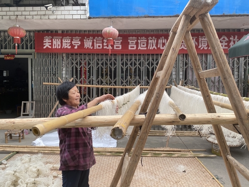 “这里的粉丝Q弹、透亮拥有独一无二好口感,真正的‘秘诀’则归功于清洗、粉碎、过滤、打浆、上蒸、摇丝、晒丝等7道传统工序,纯手工、无添加,层层把关,这样制作才能久煮而不烂、经时而不糊、夹起而不断。”钟秋霞说,“以往,每到收获季节,成堆的番薯,总让村民很发愁,晒的番薯、枣子没人要,加工的番薯粉丝、番薯淀粉无人买,这几年,为了帮助村民打通番薯粉丝的销售渠道,实现山货走出大山,促进农业高质量发展,保障农民高效率增收,鹿亭乡已经成功举办了两届粉丝节,今年的粉丝节也在筹备中。中村发展了服务乡村群众生活的‘农合联’,我们还通过“邮掌柜”帮扶结对助农, 再多的粉丝也不愁卖了。”