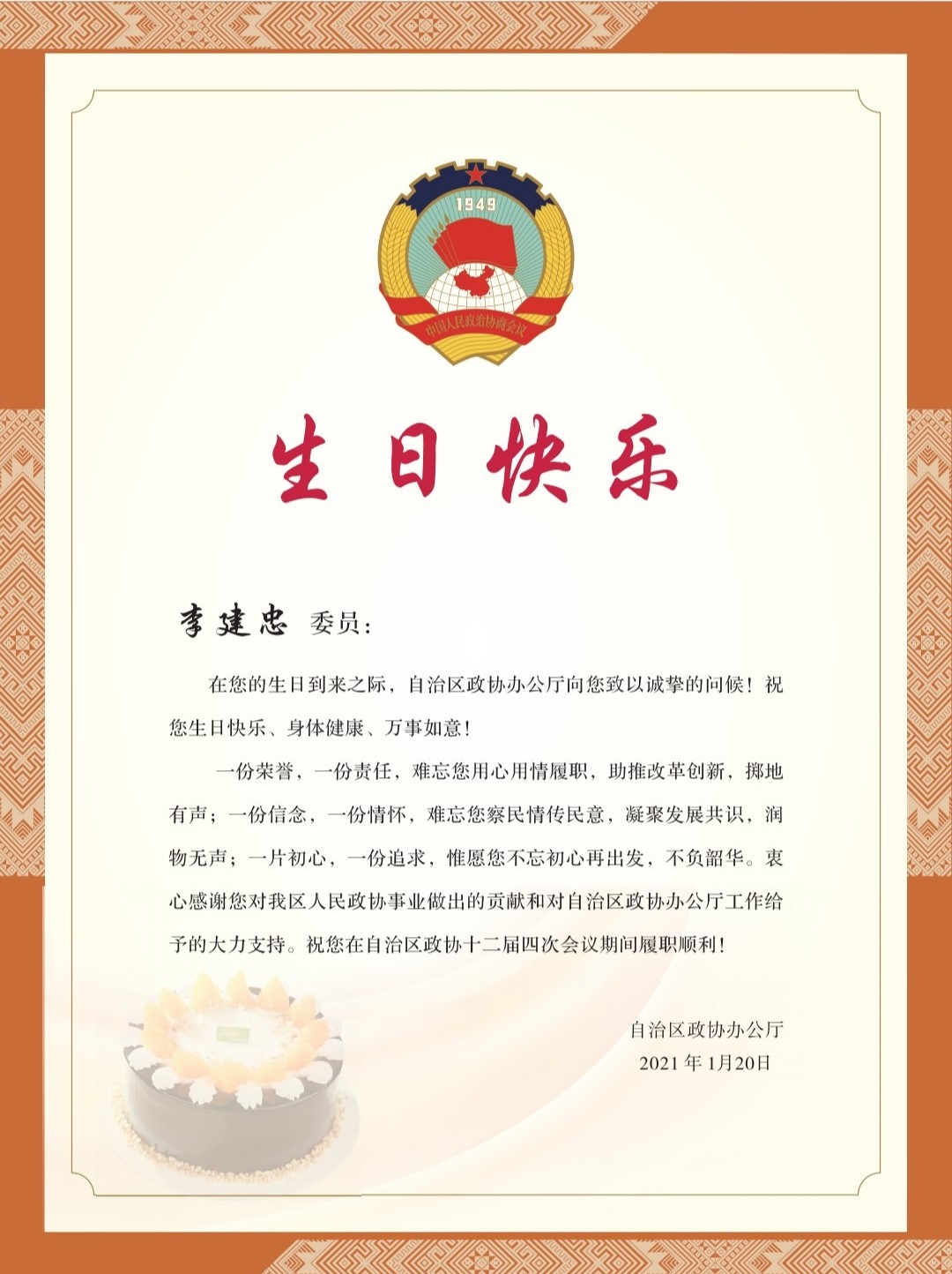 广西政协委员收到特殊生日礼物人民政协网南宁1月22日电 “一份荣誉,一份责任,难忘您用心用情履职,助推改革创新,掷地有声;一份信念,一份情怀,难忘您察民情传民意,凝聚发展共识,润物无声;一片初心,一份追求,惟愿您不忘初心再出发,不负韶华。”1月20日,广西壮族自治区政协委员李建忠正在住地宾馆房间里整理自治区两会材料,房门被敲响了,工作人员为他送上了一份生日贺卡。暖心的问候,真诚的祝愿,让当天过生日的李建忠感动不已。