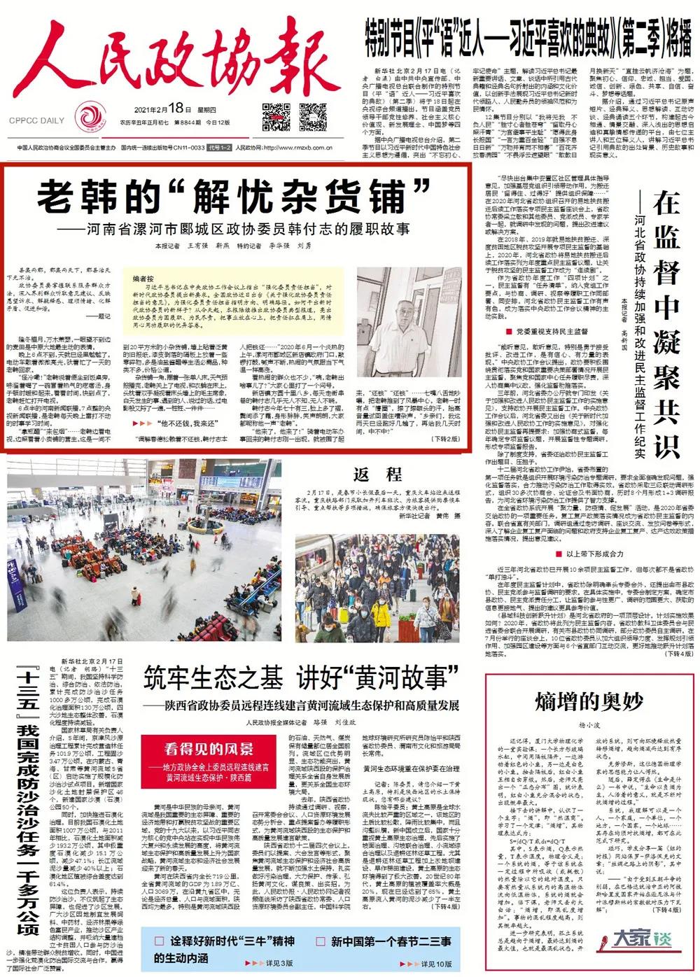 影响人、团结人、引领人,老韩拿人心换人心,把矛盾化解在了基层。“小事不出村、大事不出镇,老韩是好样的!真希望全市每个村镇都有‘老韩’,给老百姓调解更多衷肠事。”漯河市政协主席吕岩多次向外推介老韩,跟别人讲述基层政协委员韩付志的履职故事。