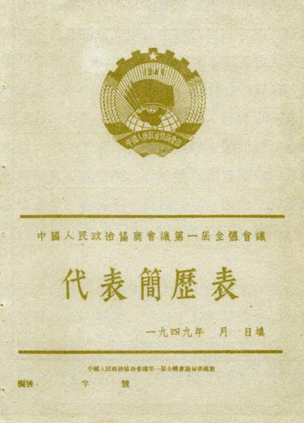 二是填写《代表简历表》。由中国人民政治协商会议第一届全体会议秘书处印制的《代表简历表》。纸质,纵26.5厘米,横19.5厘米。封面设计白底红字,庄重大方、简洁醒目。上方印有大红的中国人民政治协商会议会徽;下方分三行印有“中国人民政治协商会议第一届全体会议”“代表简历表”和“一九四九年 月 日填”等字样;最下边则分两行印有“中国人民政治协商会议第一届全体会议秘书处制”“编号: 字 号”。《代表简历表》内有两页,第一页主要包括姓名、别名或笔名、性别、年龄、民族、籍贯、代表单位、现任职务、学历、著作(出版处所及日期)、永久通讯处及电报(挂号)、暂时通讯处(宿舍、办公)及电话等项内容。右上角是足够贴两寸大小照片的“贴照片处”。第二页只有经历和备考两项,经历包括社会职业和政治活动。