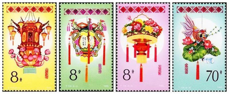 1985年2月8日发行的《花灯》特种邮票,全套共4枚。主图分别为“九莲献瑞(九莲灯)”“龙凤呈祥(龙凤灯)”“百花争艳(花篮灯)”和“金玉满堂(金鱼灯)”。花灯又称彩灯,相传起源于汉代,兴于唐宋,至今已有2000多年的历史,多采用竹木、金属、绸缎、玉佩、丝穗、纸品、玻璃等材料扎制。整套邮票都用象征一轮明月的光晕衬托花灯,增加了色调上的喜庆、明亮、欢快之感,并产生了一种花灯似乎被点燃的艺术效果。