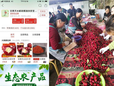 ▲拼多多平台的天水邮政精准扶贫官方店(左),帮助天水本地的农民把以前只能在本地销售的天水大樱桃(右)等农产品,卖向了全国大市场。甘天|摄