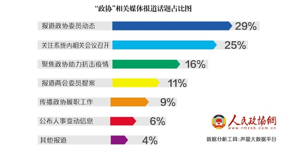 《报告》通过对媒体报道分析梳理得出:关于政协委员动态、关注政协系统内相关会议召开、聚焦人民政协助力抗击新冠肺炎疫情、报道两会政协委员提案、传播政协履职工作、公布人事变动信息等话题受关注度较高。通过对网民言论分析梳理得出:热议委员两会提案、聚焦政协系统内会议、关注认可政协工作、讨论政协委员表态发言、关注政协人事任免、监督政协干部行为规范等话题受网民关注度较高。