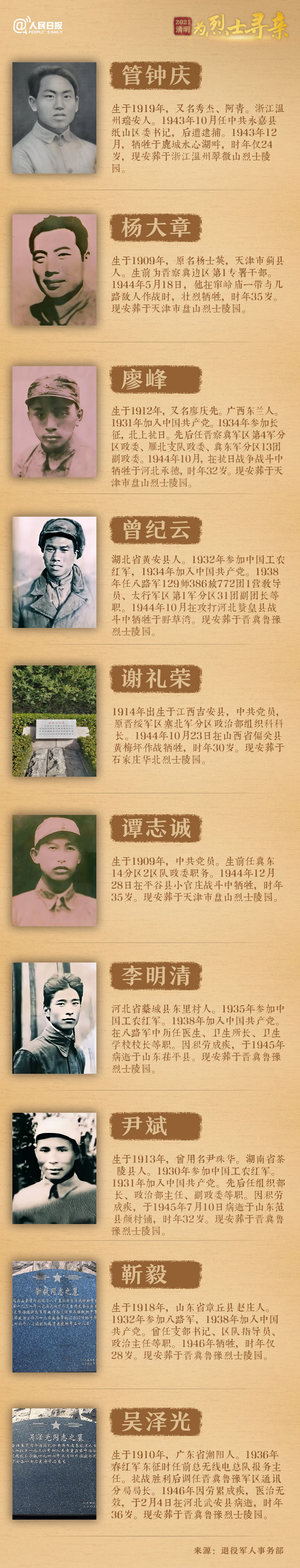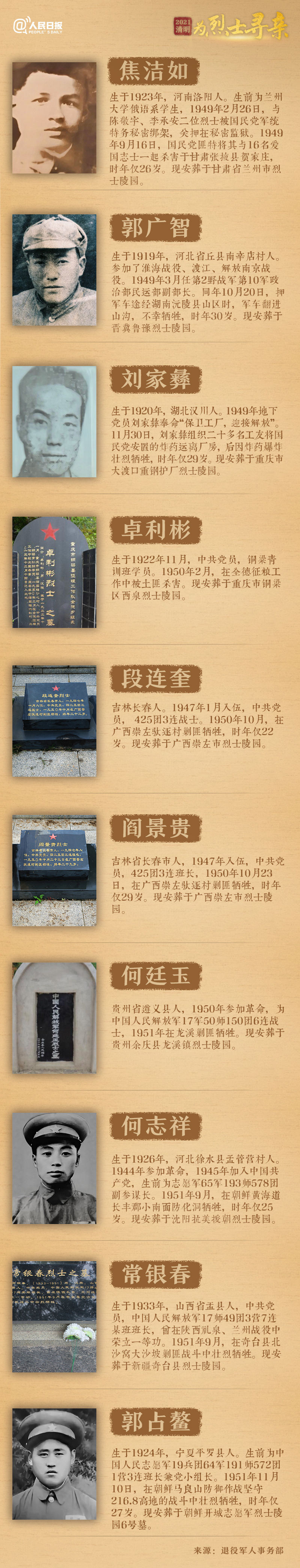 同时,退役军人事务部联合人民日报客户端等媒体,公布100位烈士的寻亲线索。这100位烈士的牺牲时间跨越1928年到1984年。烈士们生前有的是军人,有的是地下党员,有的是工人,有的是教师学生。不少烈士的出生年份等关键信息缺失,一些烈士未留下照片。