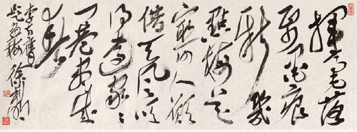 观赏书画作品,其方法可用“远观其势,近取其质”八个字概括之。首先观察其整体气势、气息与情调、意境,感受其情感风韵,佳作往往在这方面具有很强的感染力。观赏者被感动而驻足不忍离去时,便转入认真细致的品味赏析之中,此时才对作品的“质”即表现形式及技巧的各个方面,甚至某个精彩的、意外的笔触仔细品味,这与创作同理。书家品赏文学作品,被其文学情境所感动,调动自己所掌握的书法艺术的抒情手段,将文学语言变为书法语言,实现文学情境向书法艺术情境的转换。其中,书家的个性情感与审美理想起着创造性的调控作用。