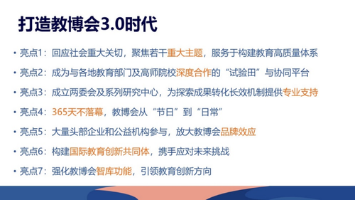 总之,教博会在追求新突破、新变化的同时,始终坚持不变的是:汇聚多方力量,系统展现基础教育创新发展的中国智慧;连接国内国际,聚焦全球教育创新前沿发展动态;倡导公益精神,以普惠性、开放性、发展性立足当下、服务未来。搭建政府、教育部门、企业、公益组织等社会各界共同参与教育创新的平台,不断发现可复制、可推广的优秀教育创新成果,建立行之有效的发现、培育和推广教育创新成果的新机制,推动教育创新成果不断涌流,促进优秀教育资源广泛惠及每一所学校、每一位教师、每一名学生,助力中国教育的系统创新与转型升级。