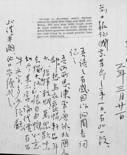 俄国二月革命后,胡适于1917年3月21日看到消息:“成群的学生很容易从他们的黑色制服和蓝帽子被辨认出来,他们中还混有许多起义士兵的粗布衣裳;各色人等杂入其中。眼下他们消除了党派之争,为了一个更伟大的事业团结成一体。”很是激动感奋,于是按照中国传统文人的方式,开始填词《沁园春·俄京革命》:“吾何何思?冻雪层冰,北国名都。想乌衣兰帽,轩昂年少,指挥杀贼,万众欢呼。去独夫‘沙’,张自由帜,此意如今果不虚。论代价,有百年文字,多少头颅。”胡适当时填写了上阕。