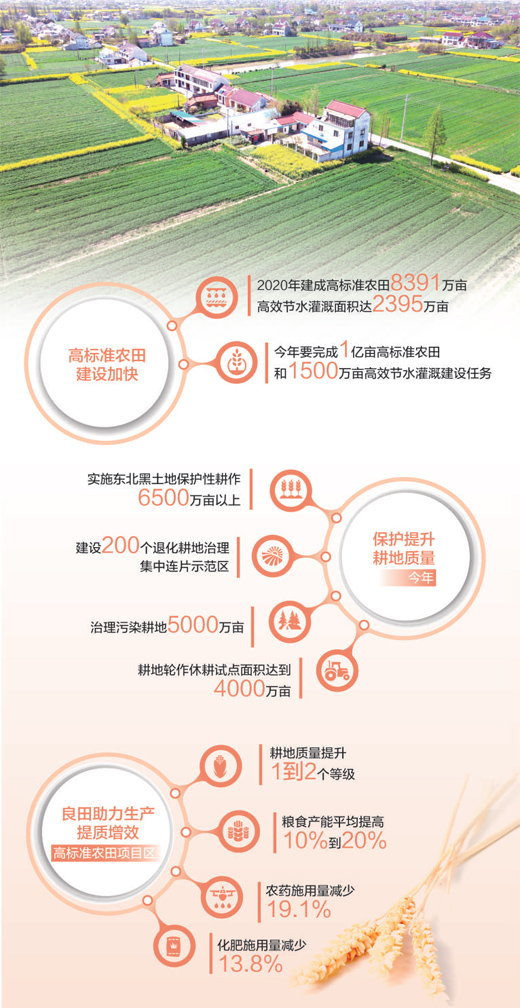 耕地是宝贵的资源。针对地块破碎、灌排不畅、机耕道标准低等问题,农业农村部大力推进高标准农田建设。2020年中央财政农田建设补助资金总额达867亿元,全年建成高标准农田8391万亩,高效节水灌溉面积达2395万亩。