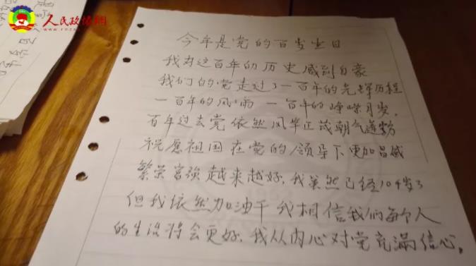 今年是党的百岁生日,我为中国共产党百年的历史感到自豪,我们的党走过了一百年的光辉历程、一百年的峥嵘岁月。百年过去,党依然风华正茂、朝气蓬勃,祝愿祖国在党的领导下更加繁荣富强。我虽然已经104岁了,但我依然“加油干”,我相信我们每个人的生活将会更好,我从内心对党充满信心。
