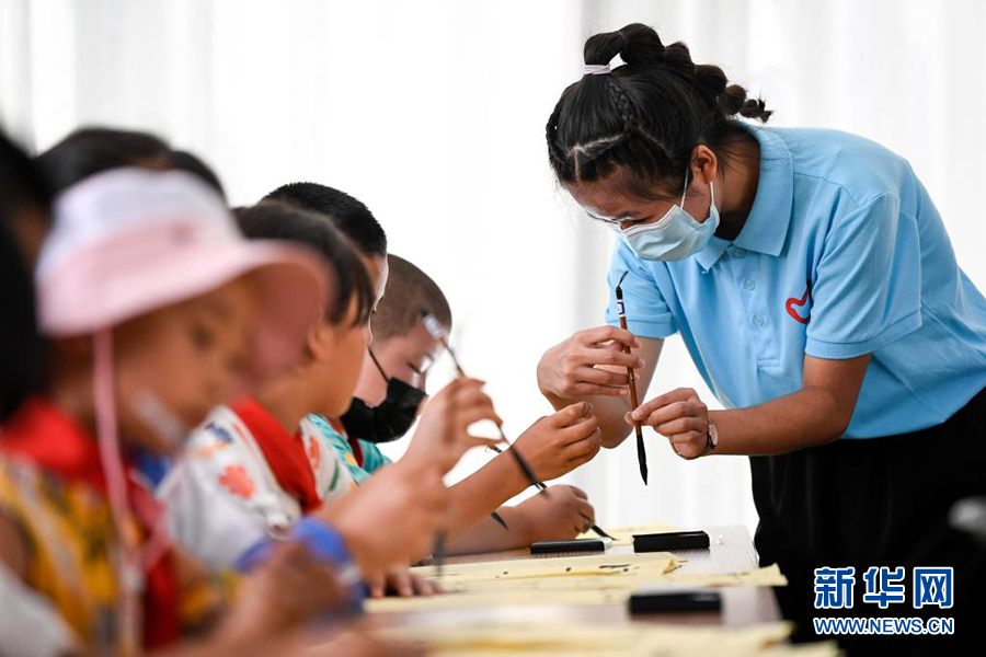 7月30日,返乡大学生志愿者(右一)在宁夏银川市兴庆区掌政镇新创家园社区为学生指导毛笔握持姿势。