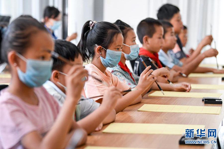 7月30日,宁夏银川市兴庆区掌政镇新创家园社区学生在公益暑托班练习毛笔握持姿势。