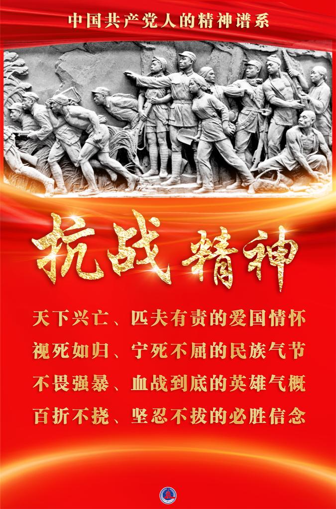 习近平总书记在纪念中国人民抗日战争暨世界反法西斯战争胜利75周年座谈会上指出,中国人民在抗日战争的壮阔进程中孕育出伟大抗战精神,向世界展示了天下兴亡、匹夫有责的爱国情怀,视死如归、宁死不屈的民族气节,不畏强暴、血战到底的英雄气概,百折不挠、坚忍不拔的必胜信念。