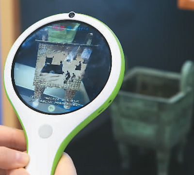 第十七届中国(深圳)国际文化产业博览交易会上,众多参展团带来5G、物联网等共性技术在文化产业领域的集成应用和创新。图为参观者用“AR探究镜”扫描文物模型,了解文物信息。新华社记者 毛思倩摄