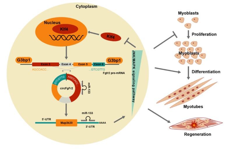 该研究基于团队海量转录组数据,绘制了猪27个生长发育时间点骨骼肌的首张环状RNA动态图谱,共鉴定52918条高信度的环状RNA,其中2916条在人、小鼠和猪等物种间高度保守。功能分析表明,circFgfr2抑制肌细胞增殖、促进肌细胞分化和肌肉再生,并提出circFgfr2通过miR-133/Map3k20/JNK/Klf4反馈环调控骨骼肌生长发育的新机制。该研究不仅有利于进一步全面解析猪骨骼肌生长发育的分子机制,为阐明猪产肉性状形成遗传基础提供新理论,为分子育种提供新的候选基因,也对人类肌肉相关疾病研究具有重要参考价值。