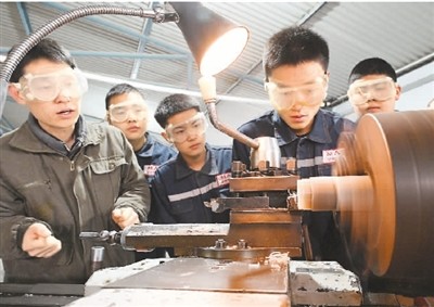 2021年,河北省优化职业教育结构和布局,通过“校企结合”“工学结合”等方式,拓宽毕业生就业渠道。图为2021年12月9日,河北省邯郸市峰峰矿区职业教育中心机械加工专业的学生在实训室学习车削轴类零件。