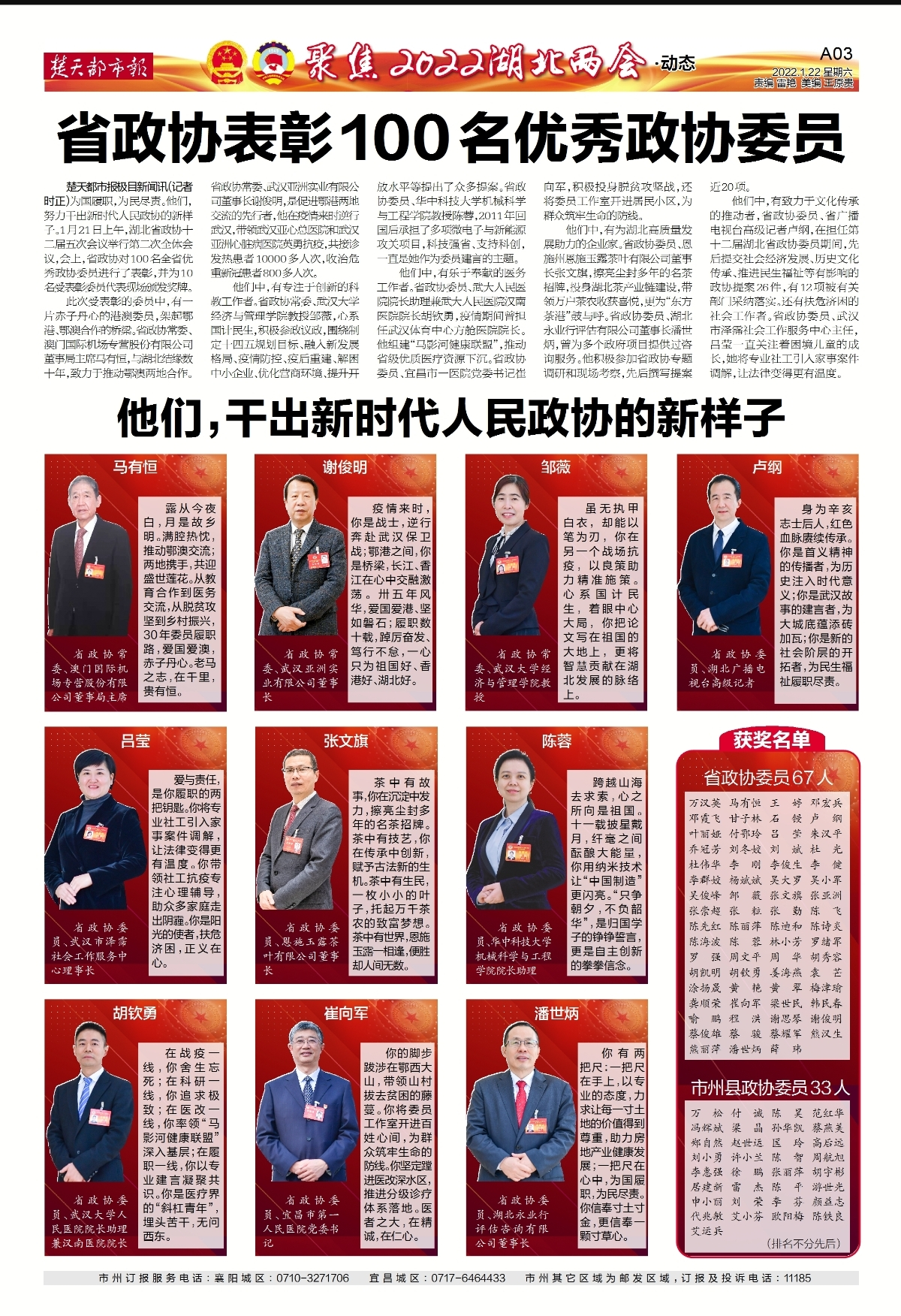 2022年1月22日的《楚天都市报》卢纲等委员获奖的整版图文报道