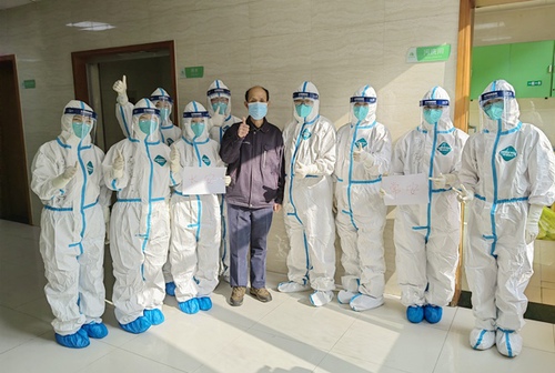 农工党党员、宝鸡中心医院副院长姚亚洲(右四)带队接管西安胸科医院的一个隔离病区,图为队员欢送患者出院