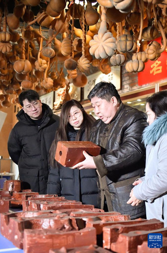 赵伟(右二)向徒弟们介绍天津葫芦制作技艺使用的瓦模(2月10日摄)。 新华社记者 孙凡越 摄