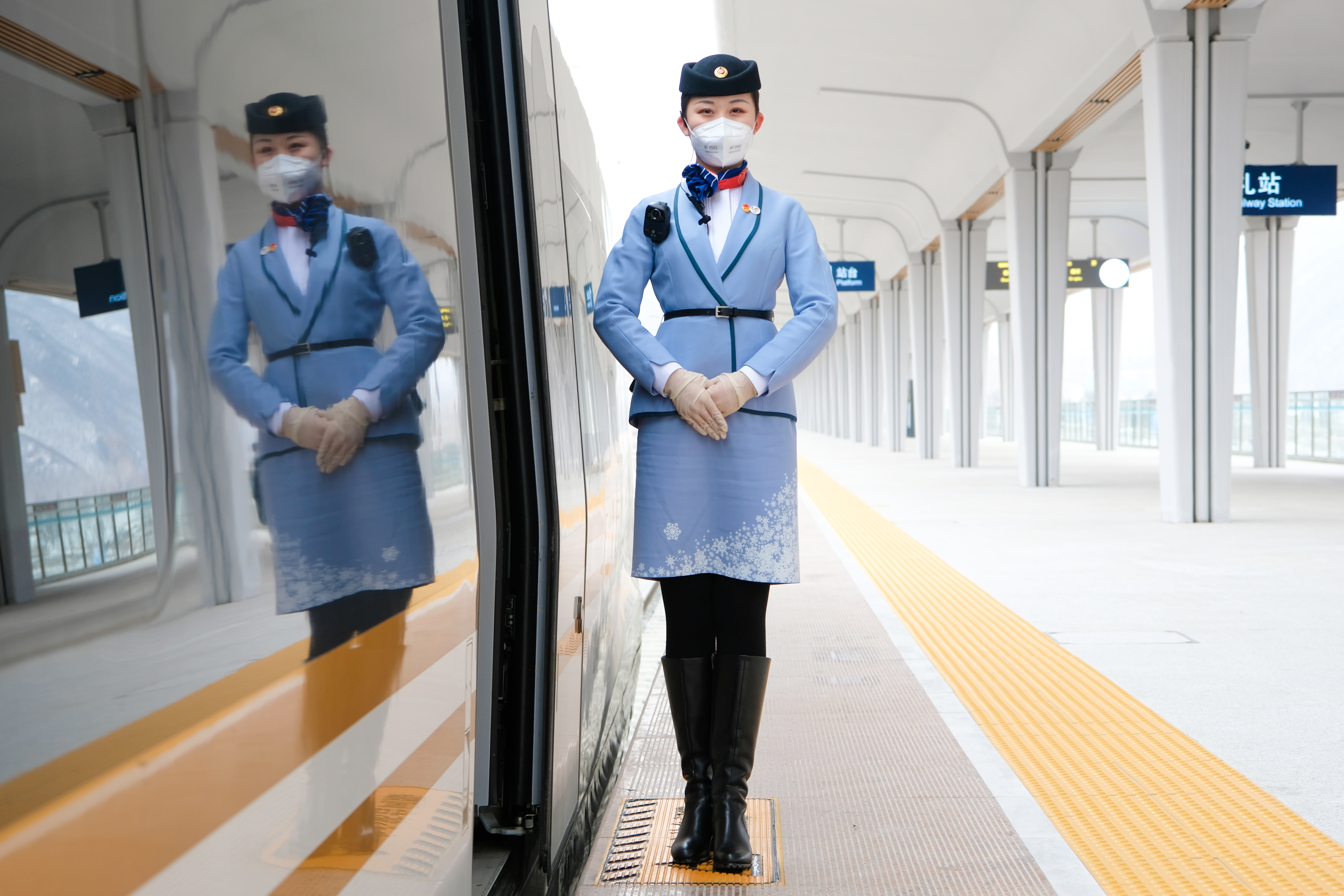 北京客运段京张高铁“雪之梦”乘务组换上象征冰雪的蓝色制服,以最饱满的精神面貌,开始冬奥列车的每一项服务工作。