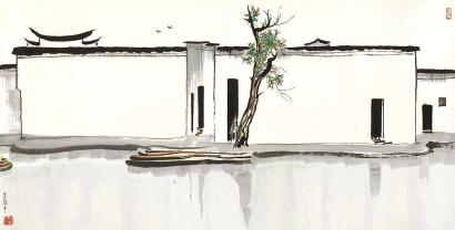 在这些现当代美术大师大家中,吴冠中无疑是对江南水乡题材着力最多、成就较大的一位。他的不少代表作都与江南水乡有关。江南水乡在吴冠中的笔下得到了精彩的创造性的阐释。作为生于江南、成长于水乡的画家,吴冠中对江南有着浓厚的情谊。他也曾对学生说起“一回到江南我就会激动……”“我一辈子断断续续总在画江南……”吴冠中画江南不受既定技法的限制,汲取了丰富的现代艺术表现手段,自创新格。被中国美术馆收藏的吴冠中早期水墨画代表作《双燕》,即是典型的以江南水乡为题材的绘画作品。《双燕》的创作纯属偶然。上世纪80年代,吴冠中带着一批学生到江南去写生。在宁波火车站候车准备返校的时,吴冠中发现河对岸有一排江南典型的白墙黑瓦民居,于是掏出速写本画起来。这时火车开始检票,同伴催促吴冠中赶紧上车。虽然匆匆忙忙,但这个画面在吴冠中心中久久不能抹去,就像一坛好酒在他心中酝酿了八年,终于在1988年瓜熟蒂落,水墨画《双燕》横空面世。吴冠中后来写文章回忆说,“《双燕》着力于平面分割,几何形组合,横向的长线及白块与纵向的短黑块之间形成强对照。蒙德里安(荷兰几何抽象画家)画面的几何组合追求简约、单纯之美,但其情意之透露过于含糊,甚至等于零。《双燕》明确地表达了东方情思,即使双燕飞去,乡情依然。横与直、黑与白的对比美在《双燕》中获得成功后,便成为长留我心头的艺术眼目。如1988年的《秋瑾故居》再至1996年作《忆江南》,只剩了几条横线与几个黑点,都属《双燕》的嫡系。”“在众多江南题材的作品中,甚至在我的全部作品中,我认为最突出,最具代表性的是《双燕》。”