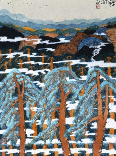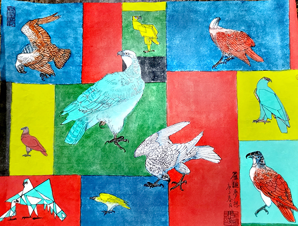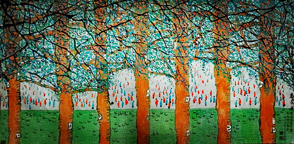 在《云锦系列》、《林趣》等众多画作中,很好地体现了诗与画的完美融合:看他的一幅画,像在读一首诗;读他一首诗,一如欣赏一幅画。