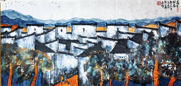 山鹏生在安徽、长在安徽,对徽州文化从小耳濡目染、浸淫有得。徽学中的“新安派”是画学中著名的流派。画中各路豪杰,对徽州古民居及独特的地域建筑艺术情有独钟,各自组画题并领风骚一方。