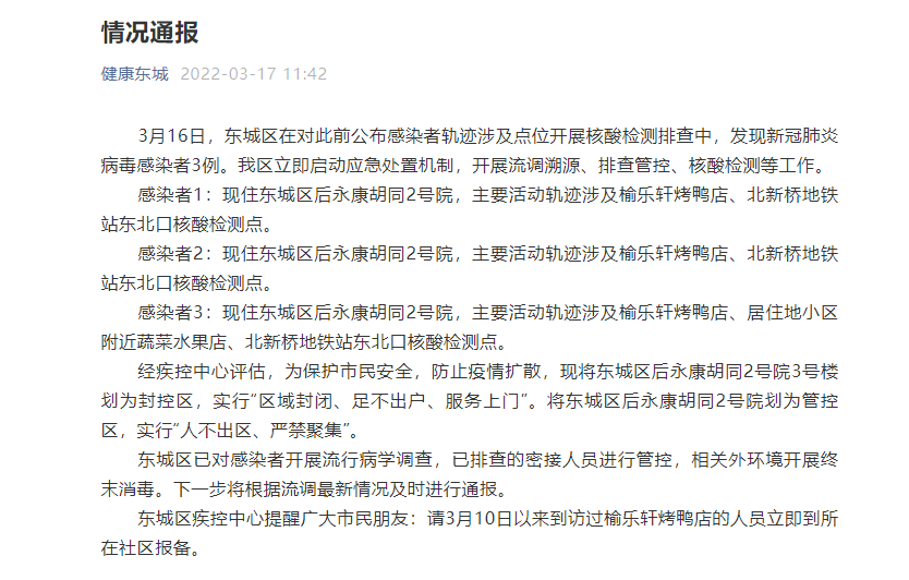 感染者3:现住东城区后永康胡同2号院,主要活动轨迹涉及榆乐轩烤鸭店、居住地小区附近蔬菜水果店、北新桥地铁站东北口核酸检测点。