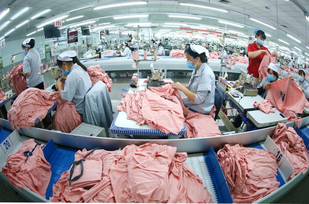3月22日,山东省青岛市即墨区即发集团有限公司的工人在生产出口到海外市场的服装产品。 新华社发(梁孝鹏 摄)