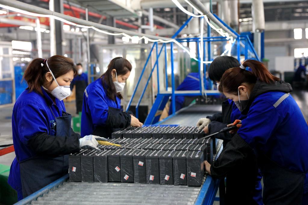 3月24日,河北新河县一家新型电池生产企业内,工作人员在生产线上加工电池。 新华社记者方思贤 摄