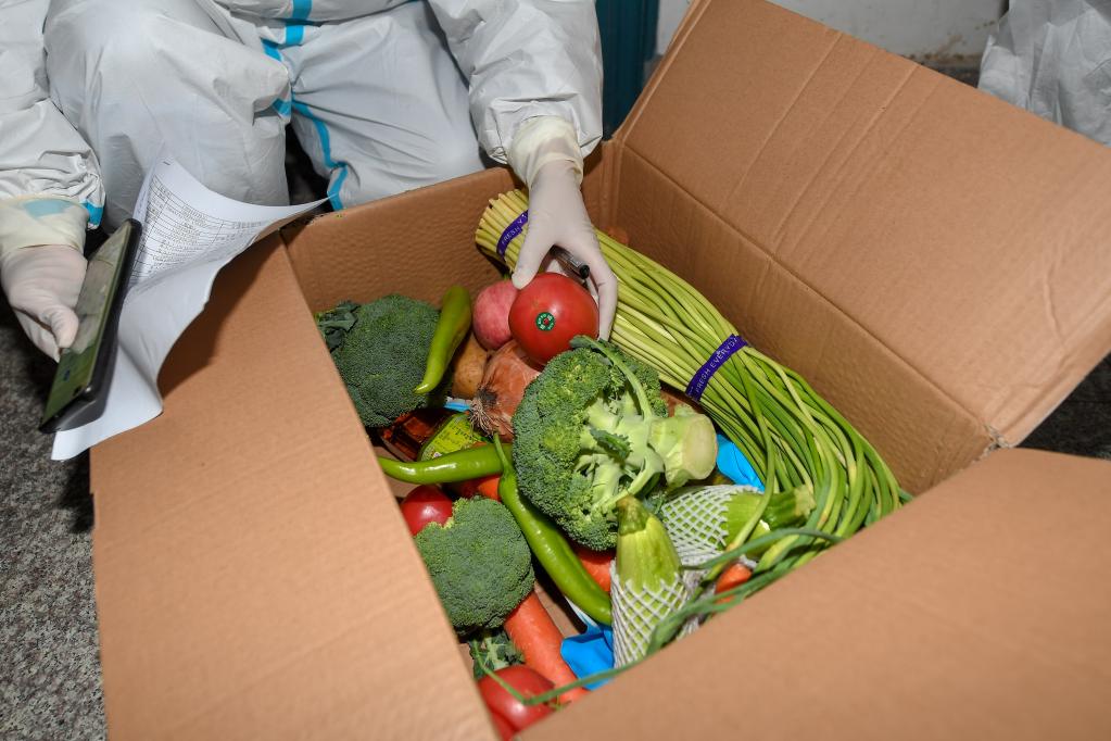 3月31日,在吉林市昌邑区哈达湾街道矿建社区,工作人员检查“蔬菜包”。新华社记者 张楠 摄
